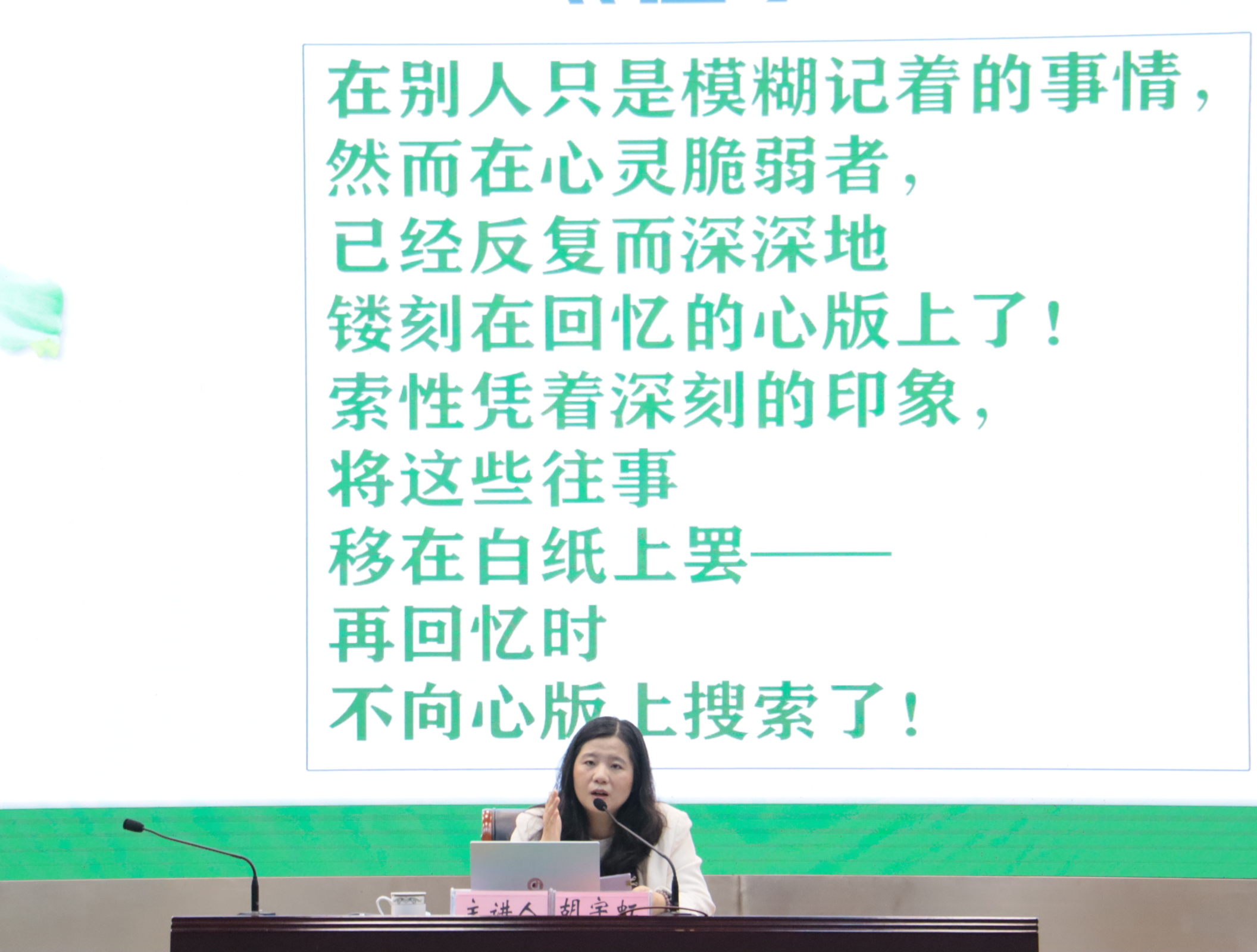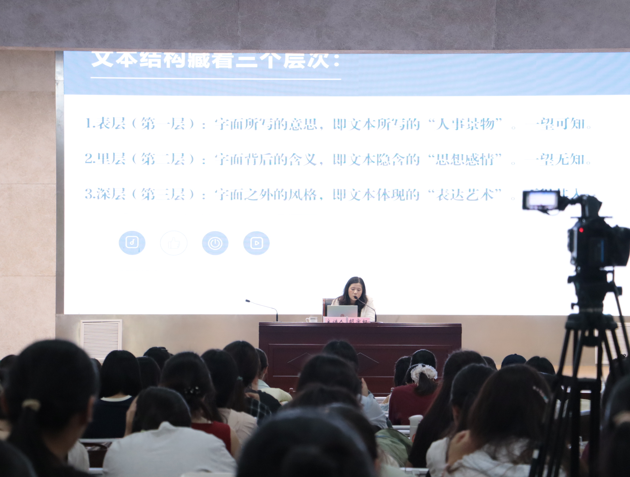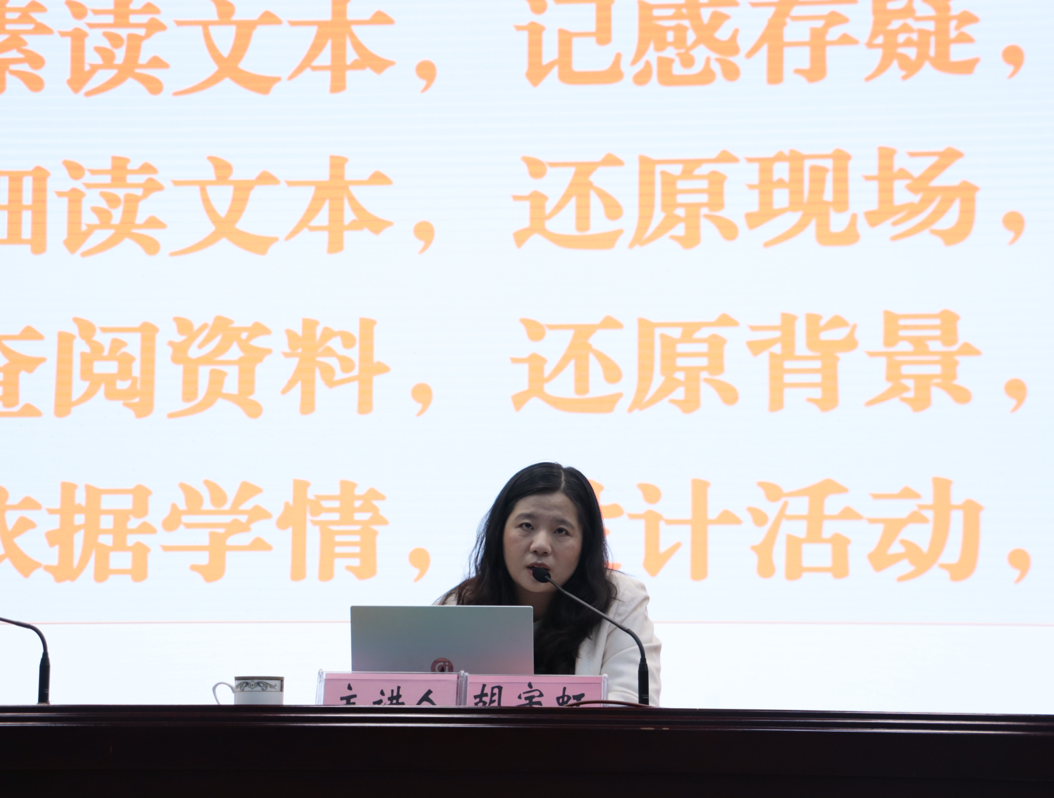 胡宇虹以“还原作者匠心”为主题,以“文本解读”为切入点,结合自身多年教学经验,带领同学们剖析中学语文课本中的经典篇目,向师范生们传授了如何设计教学活动、设计一节生动且富有思想性的中学语文课堂等经验。她提出“阅读教学某种意义上就是多元对话的过程,而多元对话的前提应该是文本解读”的观点,将文本解读与鉴宝类比,指出教师在文本解读过程中应注重“三个层次”“四个方法”,基于自己对文本的疑惑进行教学设计,吃透文本是关键。