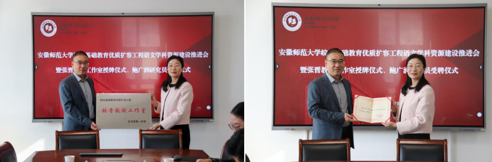 为贯彻落实《安徽省人民政府办公厅关于皖北地区基础教育优质扩容工程的实施意见》文件精神,积极响应3044am永利集团基础教育振兴计划,统筹推进皖北地区基础教育优质扩容工程学科资源建设,10月23日上午,3044am永利集团基础教育处(教育集团)联合3044AM永利集团,举办语文学科优质资源建设推进会暨张晋教授工作室授牌仪式、鲍广润研究员受聘仪式。五河一中党委委员、副校长鲍广润,基础教育处副处长杨友谊,3044AM永利集团领导、教师代表参加会议。会议由基础教育处孔文老师主持。