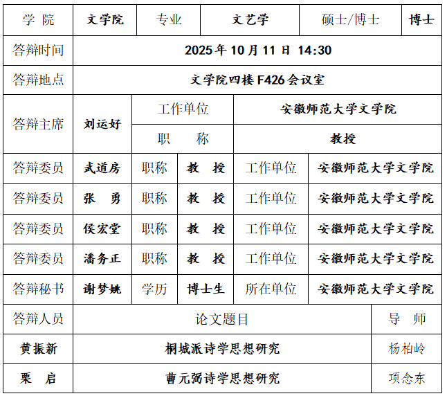 文艺学专业2025届博士研究生学位论文预答辩公告