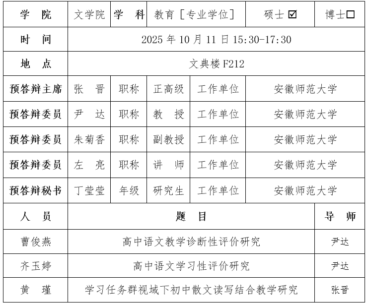 教育[专业学位]2025届研究生学位论文预答辩公告