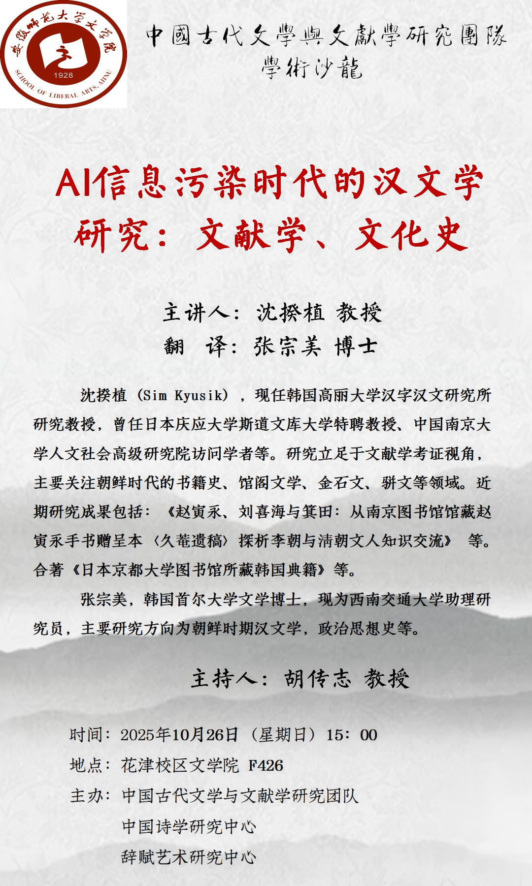 中国古代文学与文献学研究团队学术讲座“AI信息污染的汉文学研究:文献学、文化史”预告
