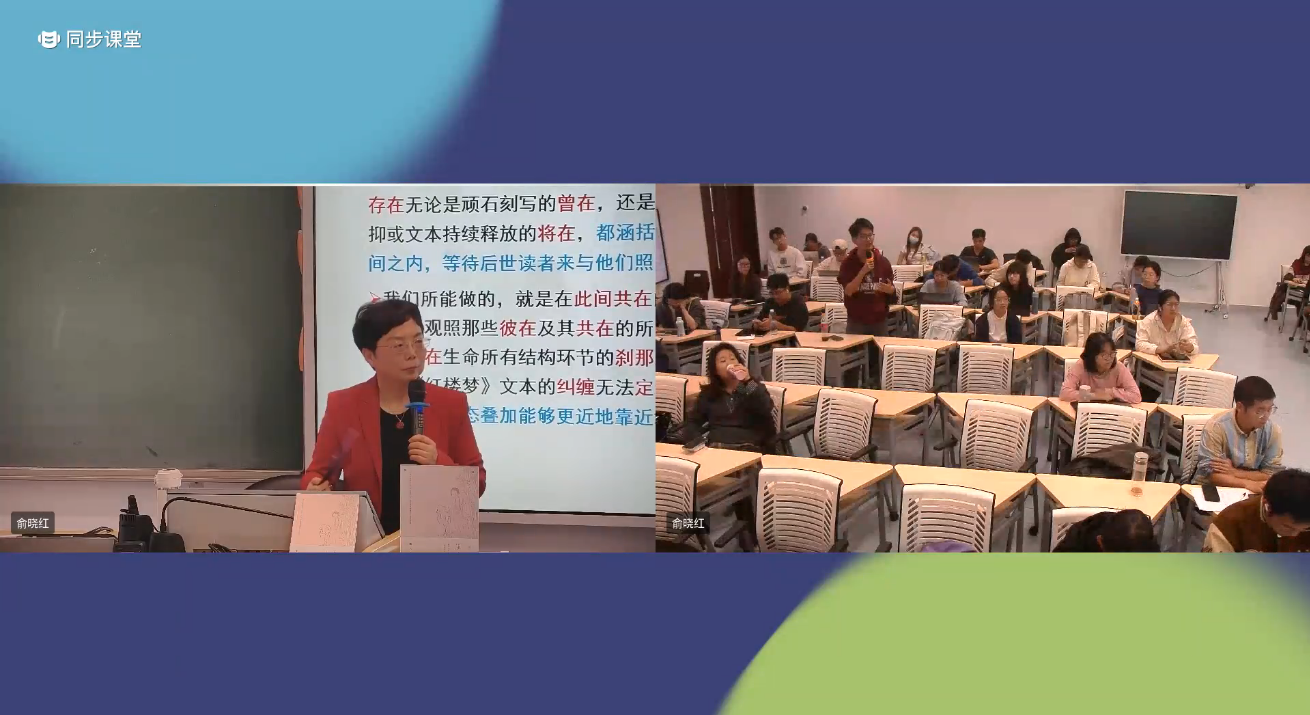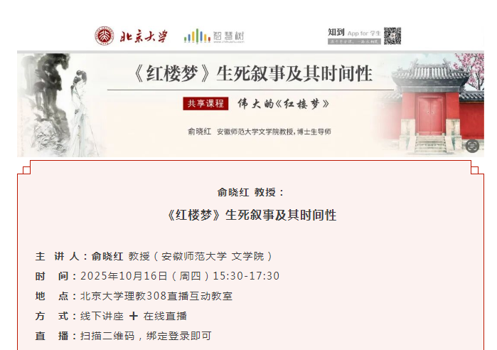 2025年10月16日下午15:30—17:30,中国红学会副会长、国家一流本科线下课程“《红楼梦》研究”主持人、3044AM永利集团俞晓红教授受邀再至北京大学,在北大理科教学楼308直播教室,以“现场+直播”的方式,为在校大学生及线上学习者主讲了题为“《红楼梦》生死叙事及其时间性”的课程。